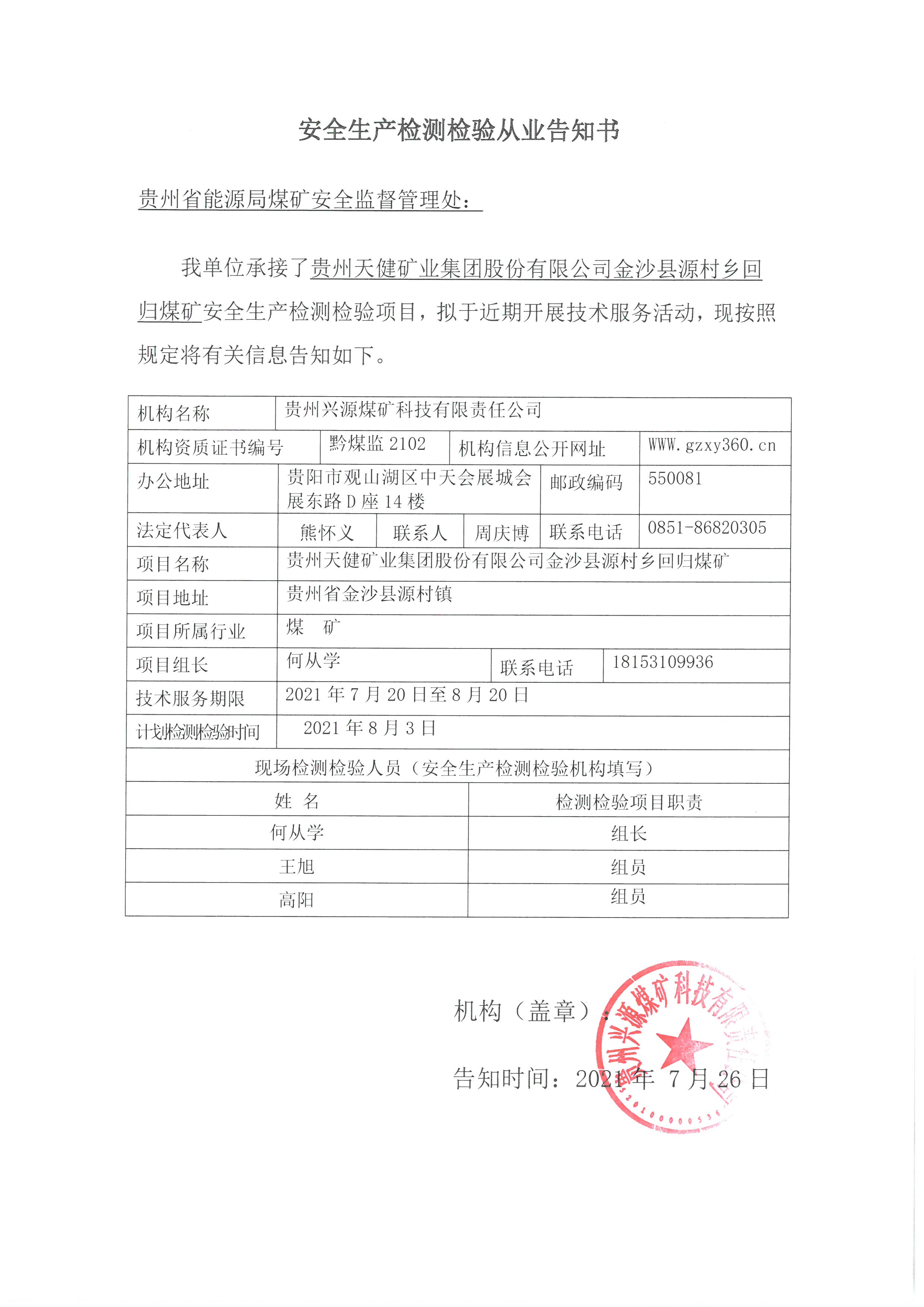 安全生產(chǎn)檢測檢驗(yàn)從業(yè)告知書【貴州天健礦業(yè)集團(tuán)股份有限公司金沙縣源村鄉(xiāng)回歸煤礦】