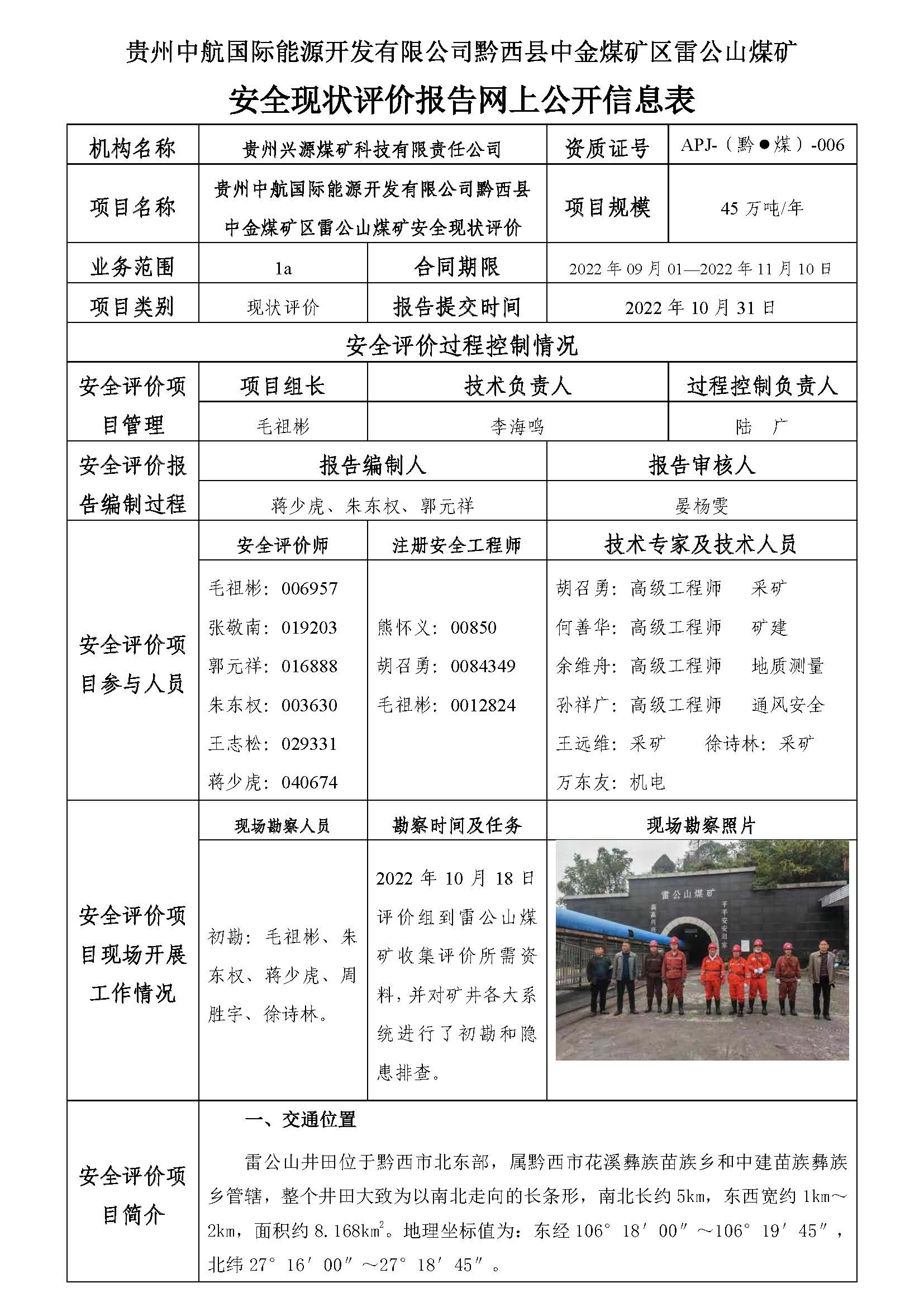 貴州中航國際能源開發(fā)有限公司黔西縣中金煤礦區(qū)雷公山煤礦安全現(xiàn)狀評價報告網(wǎng)上公開信息表