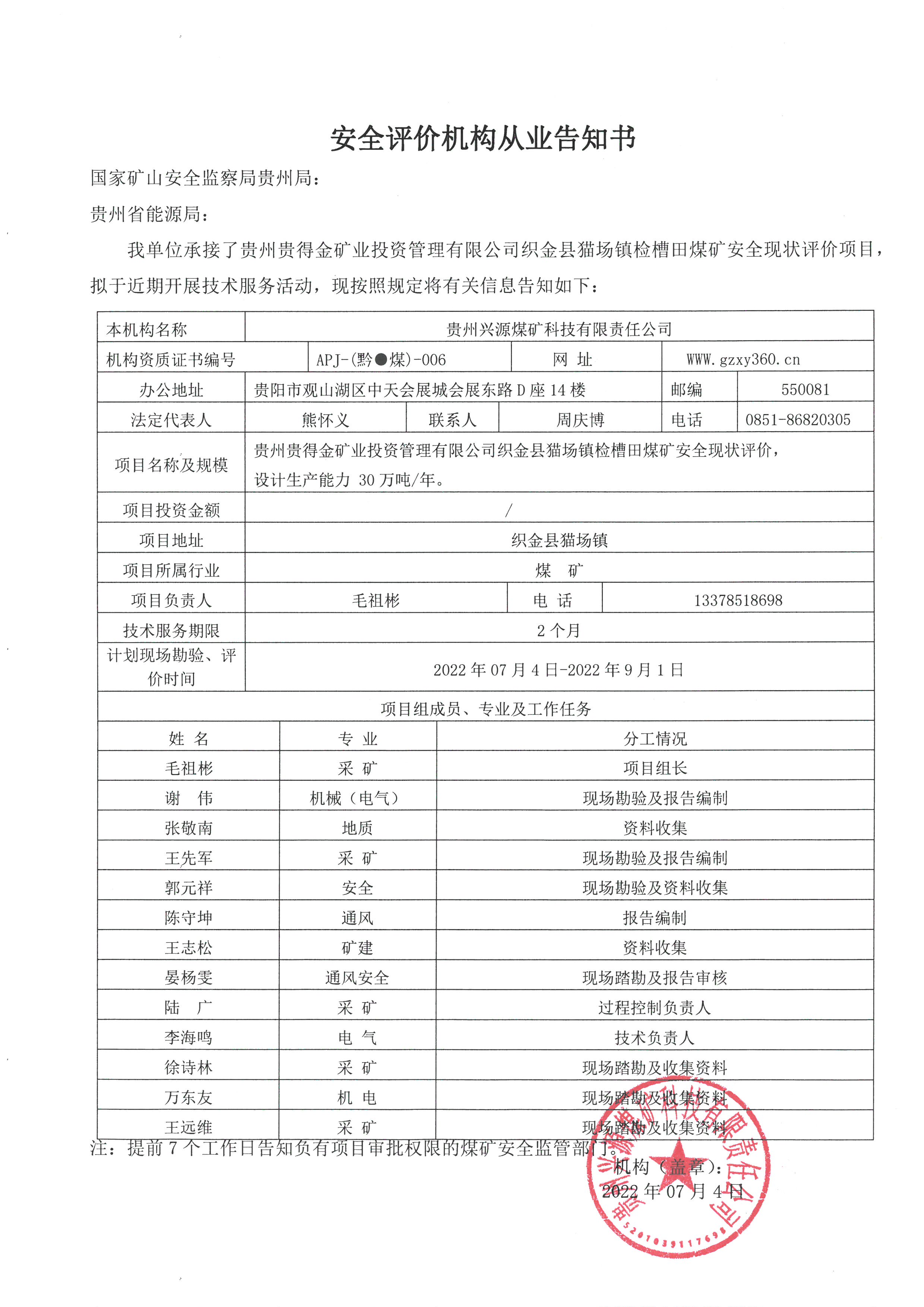 安全評價機構(gòu)從業(yè)告知書【貴州貴得金礦業(yè)投資管理有限公司織金縣貓場鎮(zhèn)檢槽田煤礦】