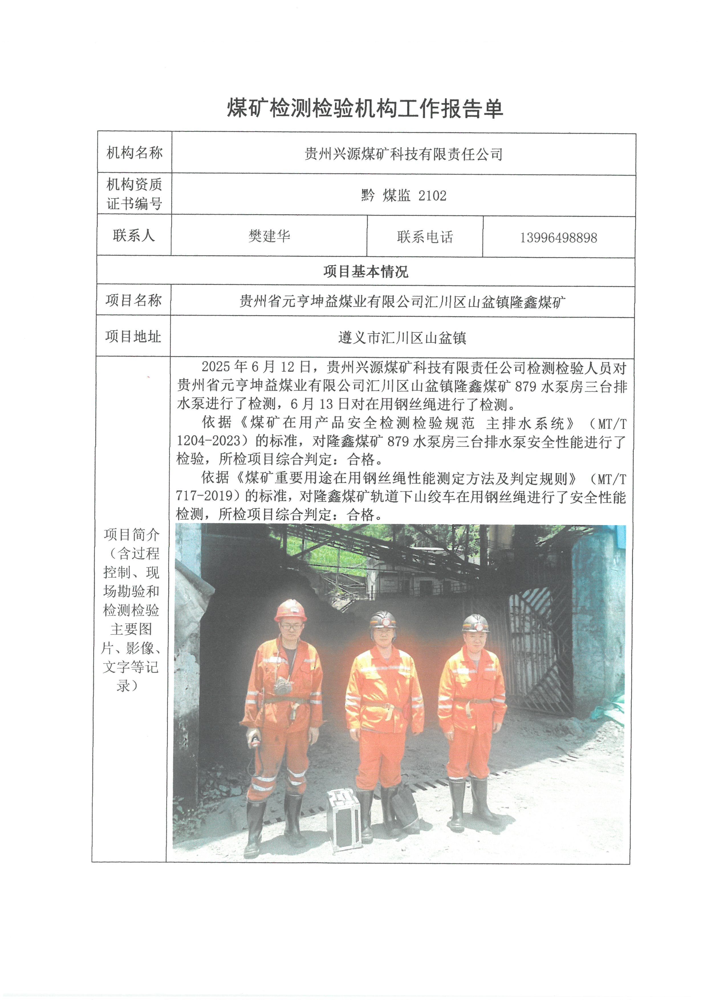 煤礦檢測檢驗機構(gòu)工作報告單【貴州省元亨坤益煤業(yè)有限公司匯川區(qū)山盆鎮(zhèn)隆鑫煤礦】