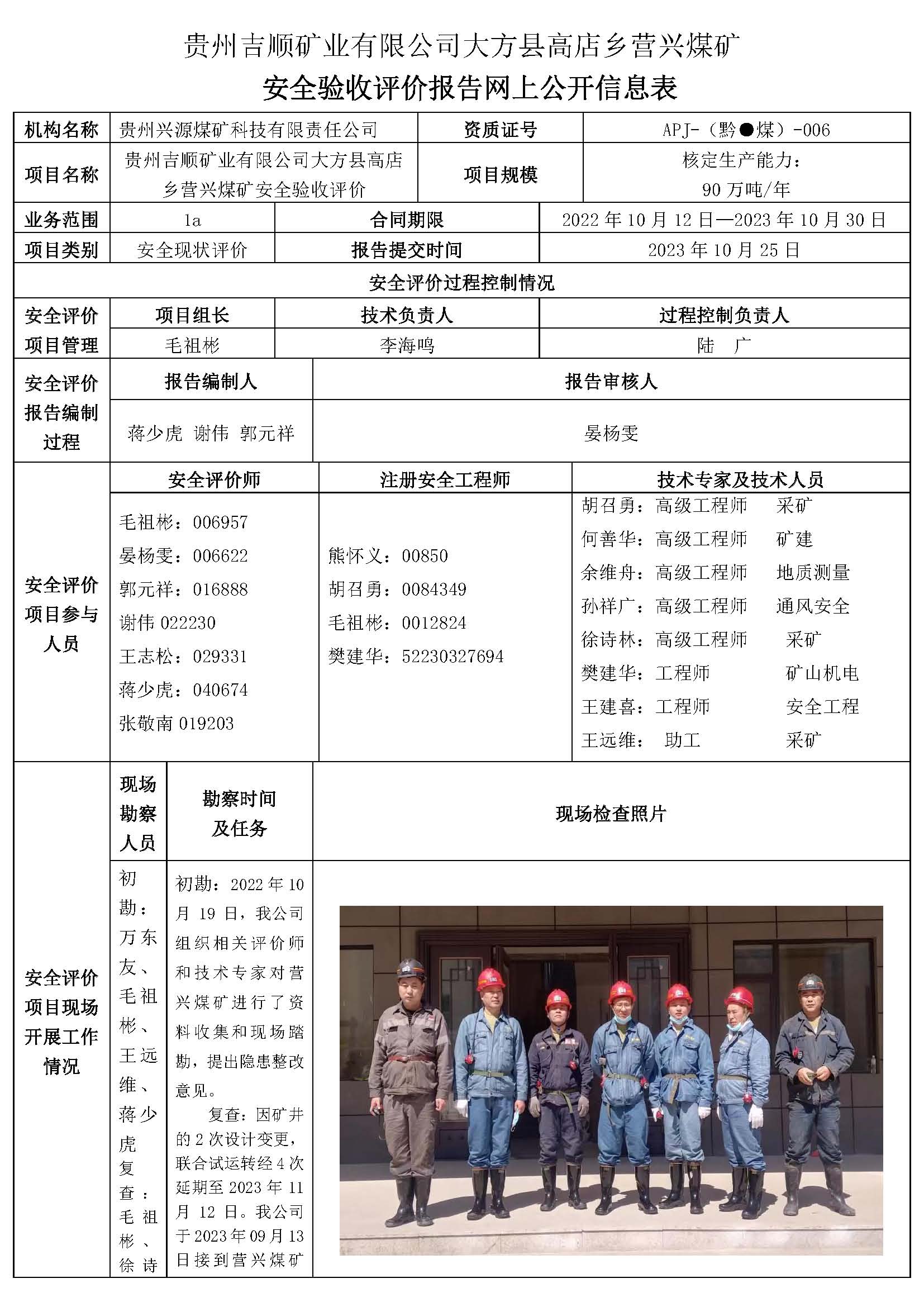 貴州吉順礦業(yè)有限公司大方縣高店鄉(xiāng)營興煤礦安全驗(yàn)收評價報告網(wǎng)上公開信息表