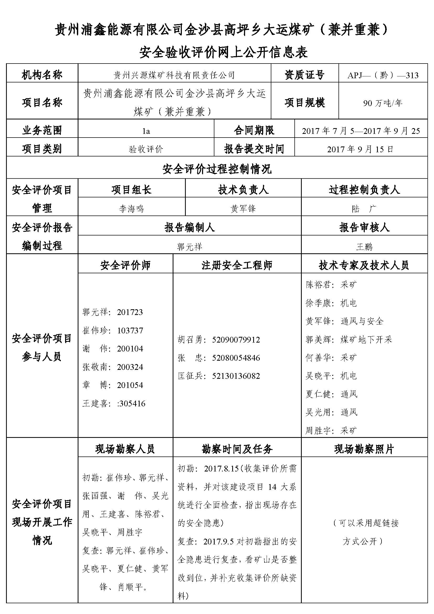 貴州浦鑫能源有限公司金沙縣高坪鄉(xiāng)大運(yùn)煤礦(兼并重兼)安全驗(yàn)收評(píng)價(jià)網(wǎng)上公開信息表