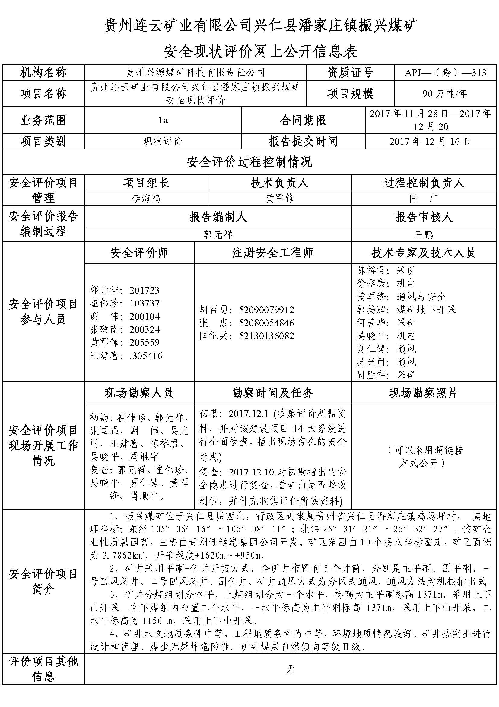 貴州連云礦業(yè)有限公司興仁縣潘家莊鎮(zhèn)振興煤礦安全現(xiàn)狀評價網(wǎng)上公開信息表