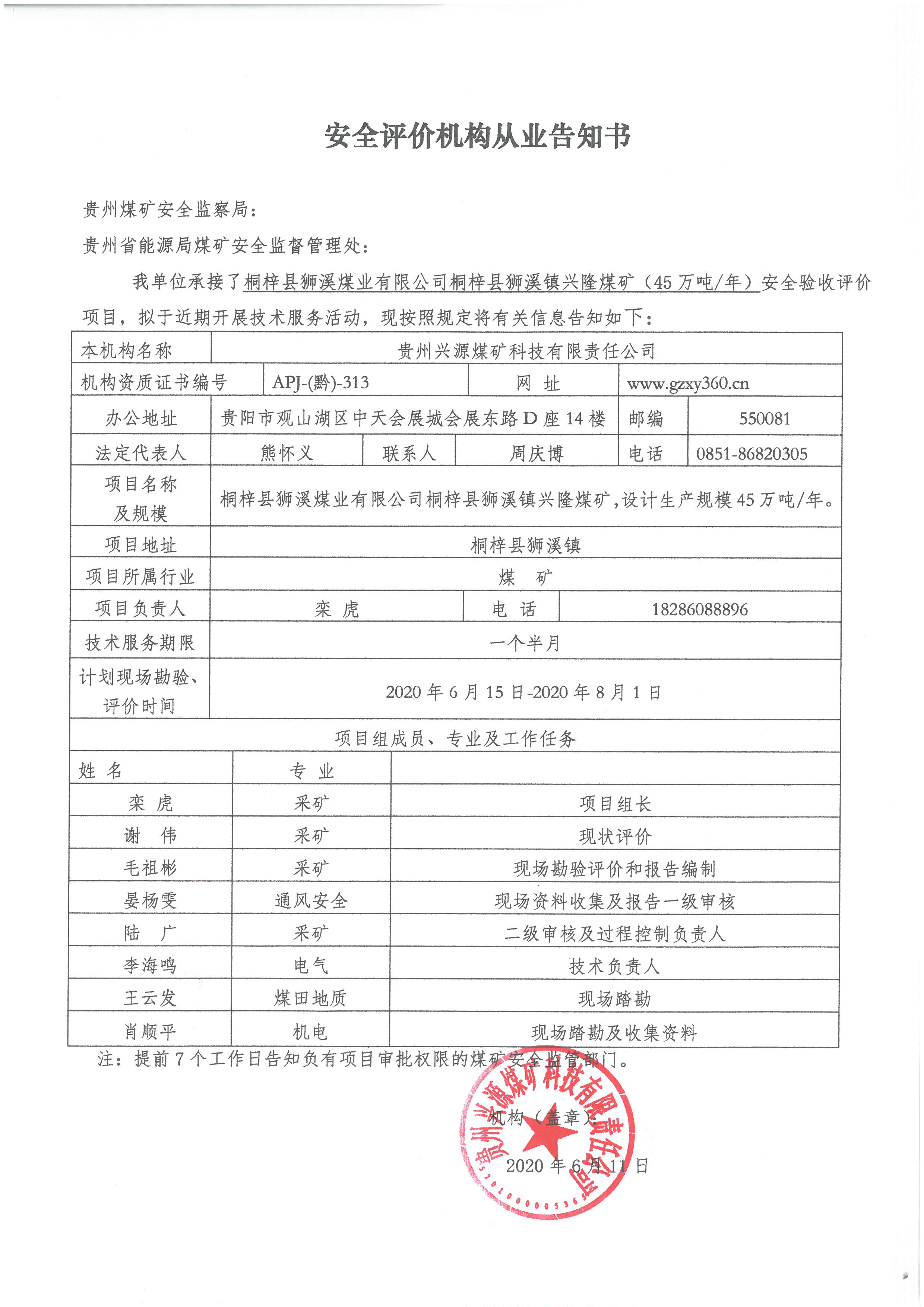 安全評(píng)價(jià)機(jī)構(gòu)從業(yè)告知書【桐梓縣獅溪煤業(yè)有限公司桐梓縣獅溪鎮(zhèn)興隆煤礦(45萬(wàn)噸/年)安全驗(yàn)收評(píng)價(jià)】