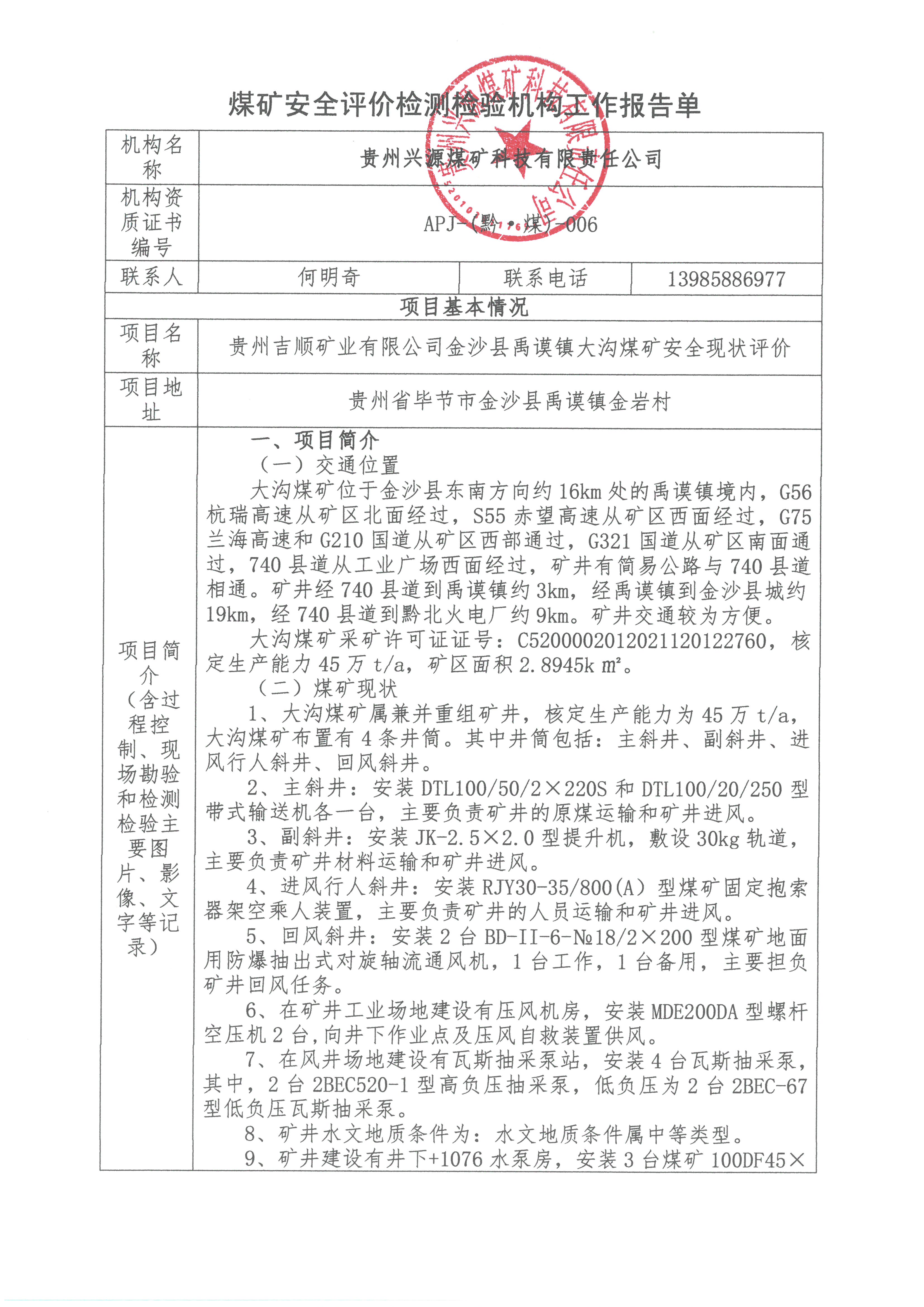 煤礦安全評(píng)價(jià)檢測(cè)檢驗(yàn)機(jī)構(gòu)工作報(bào)告單【貴州吉順礦業(yè)有限公司金沙縣禹謨鎮(zhèn)大溝煤礦安全現(xiàn)狀評(píng)價(jià)】