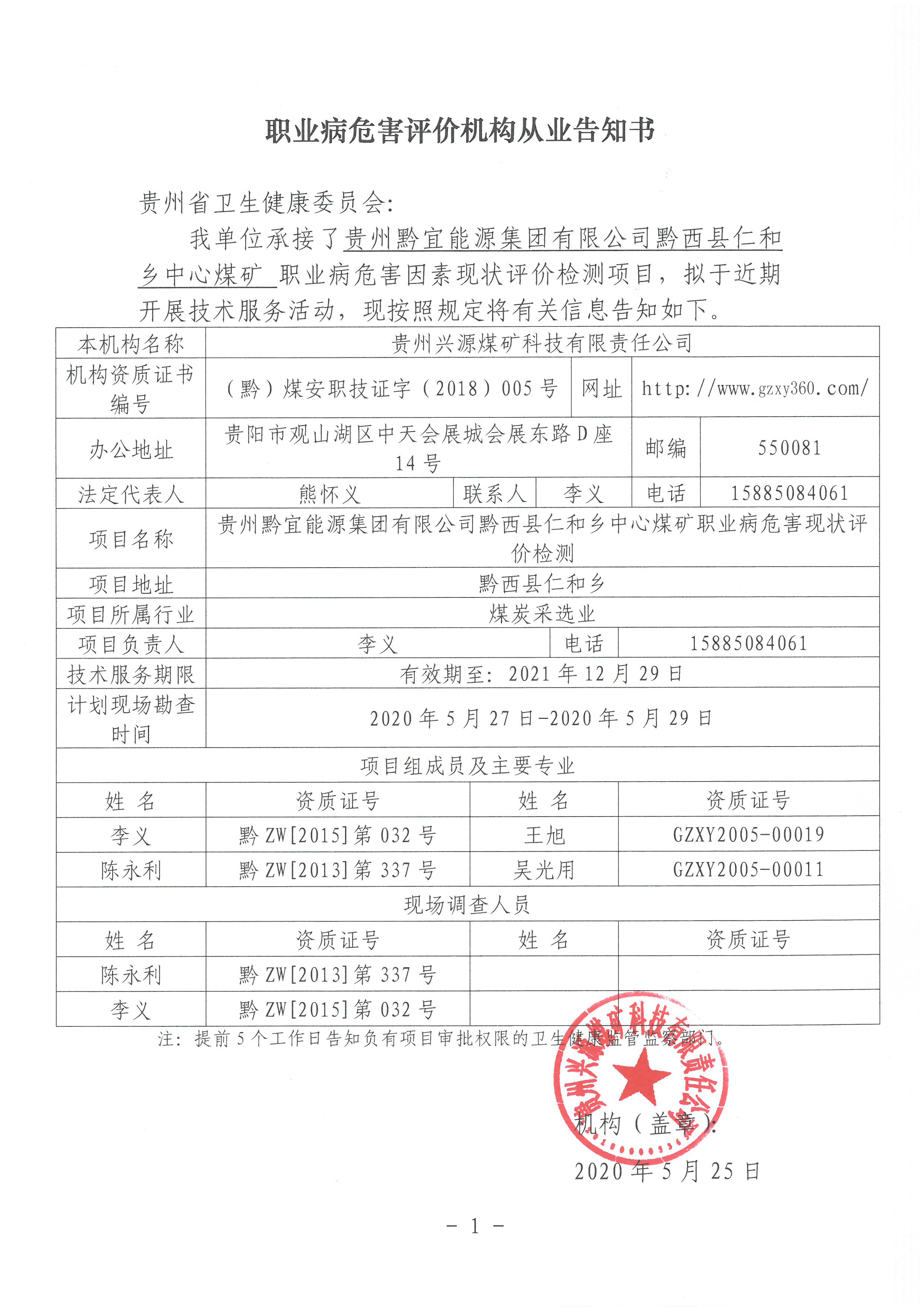 職業(yè)病危害評(píng)價(jià)機(jī)構(gòu)從業(yè)告知書【黔西縣仁和鄉(xiāng)中心煤礦】