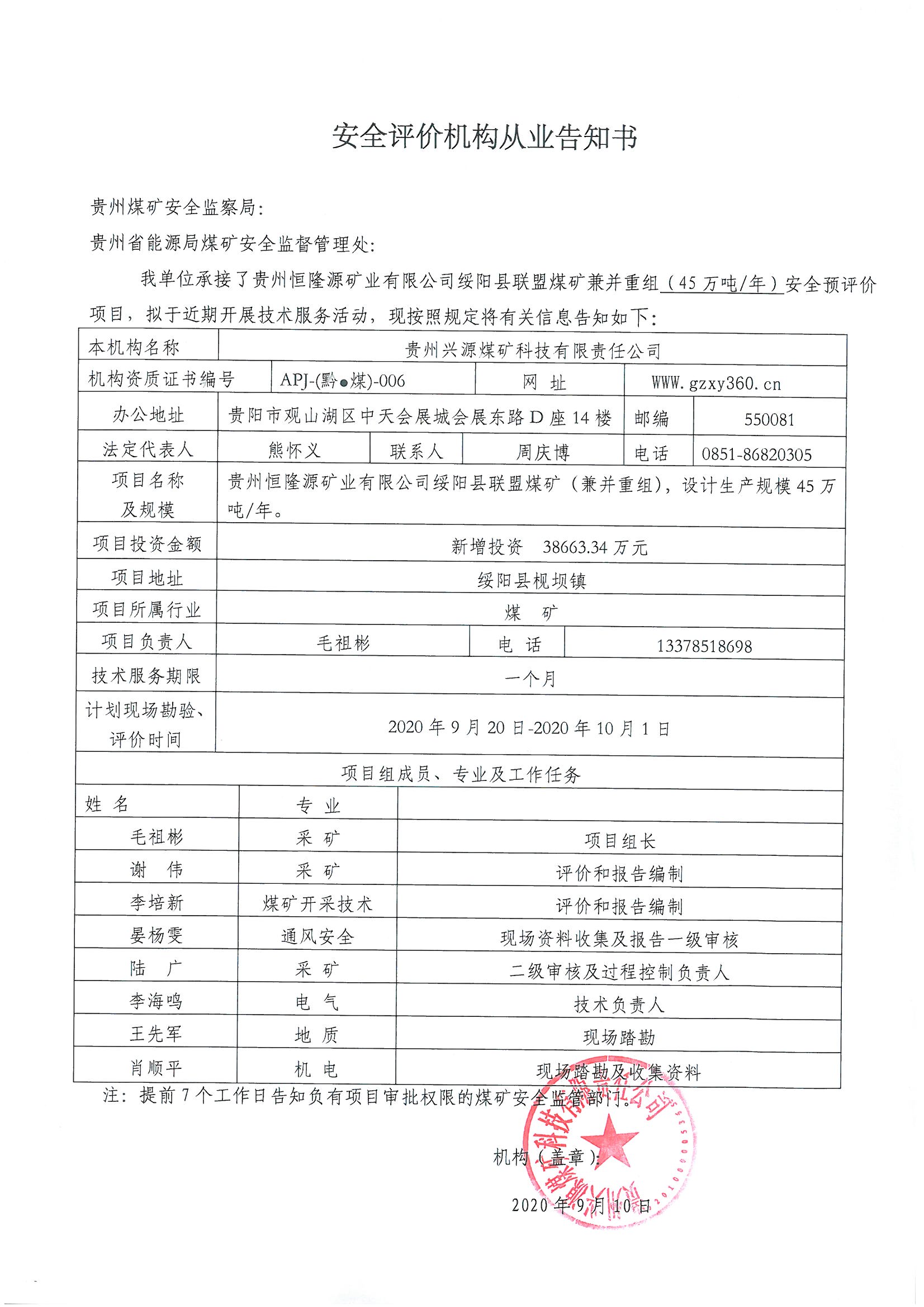 安全評(píng)價(jià)機(jī)構(gòu)從業(yè)告知書【貴州恒隆源礦業(yè)有限公司綏陽縣聯(lián)盟煤礦兼并重組】