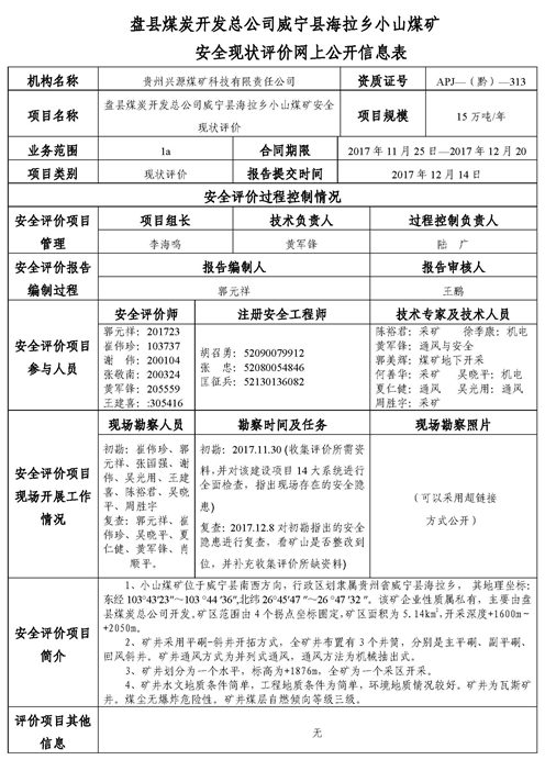 盤縣煤炭開發(fā)總公司威寧縣海拉鄉(xiāng)小山煤礦安全現(xiàn)狀評(píng)價(jià)網(wǎng)上公開信息表