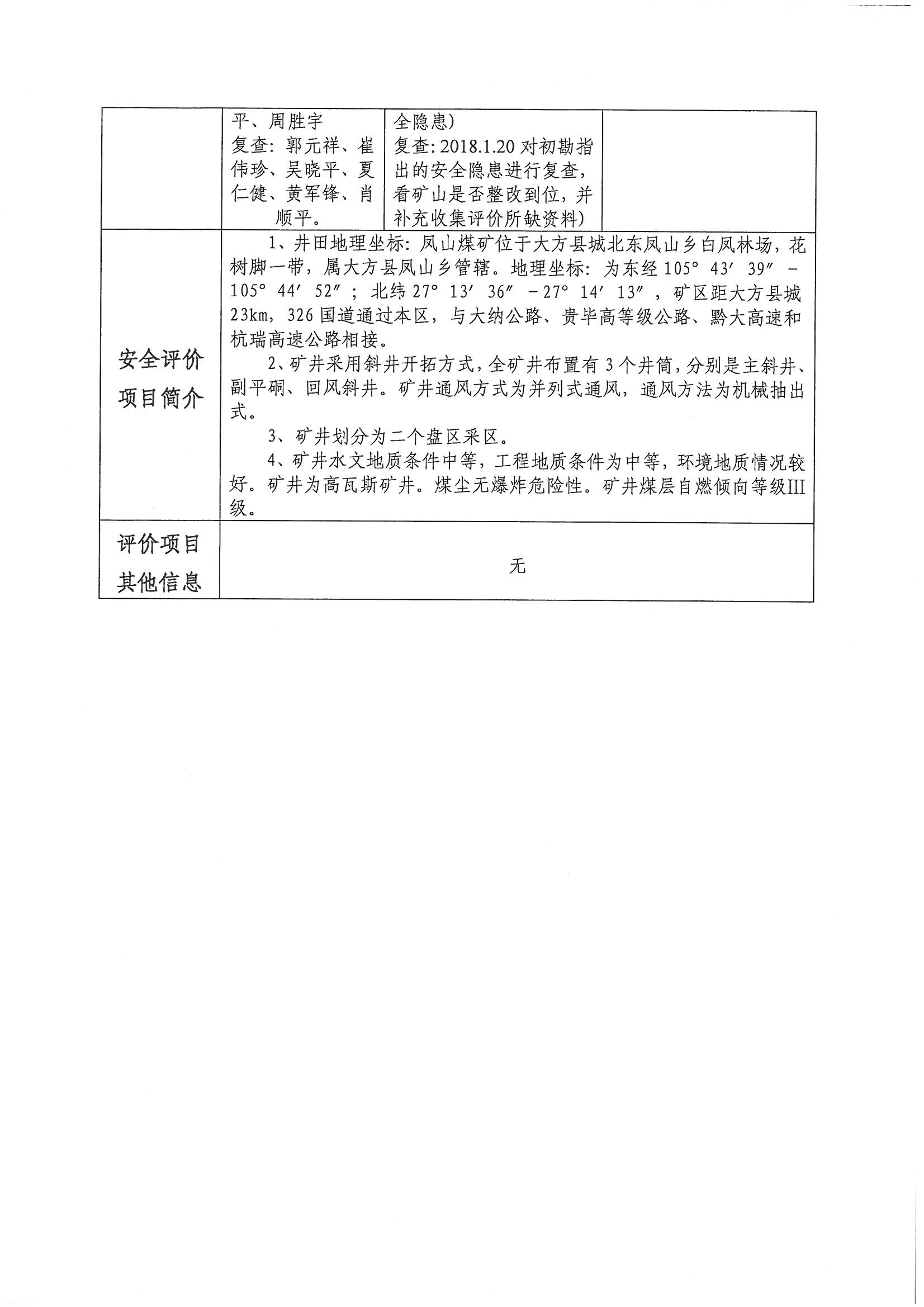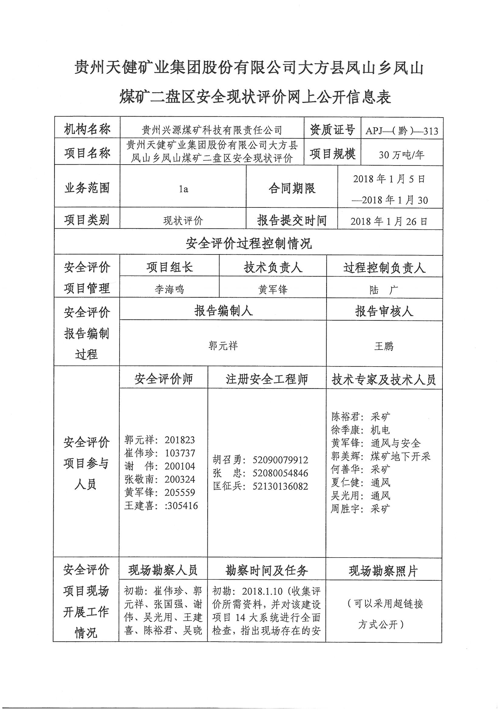 貴州天健礦業(yè)集團(tuán)股份有限公司大方縣鳳山鄉(xiāng)鳳山煤礦二盤區(qū)安全現(xiàn)狀評(píng)價(jià)報(bào)告網(wǎng)上公開信息表